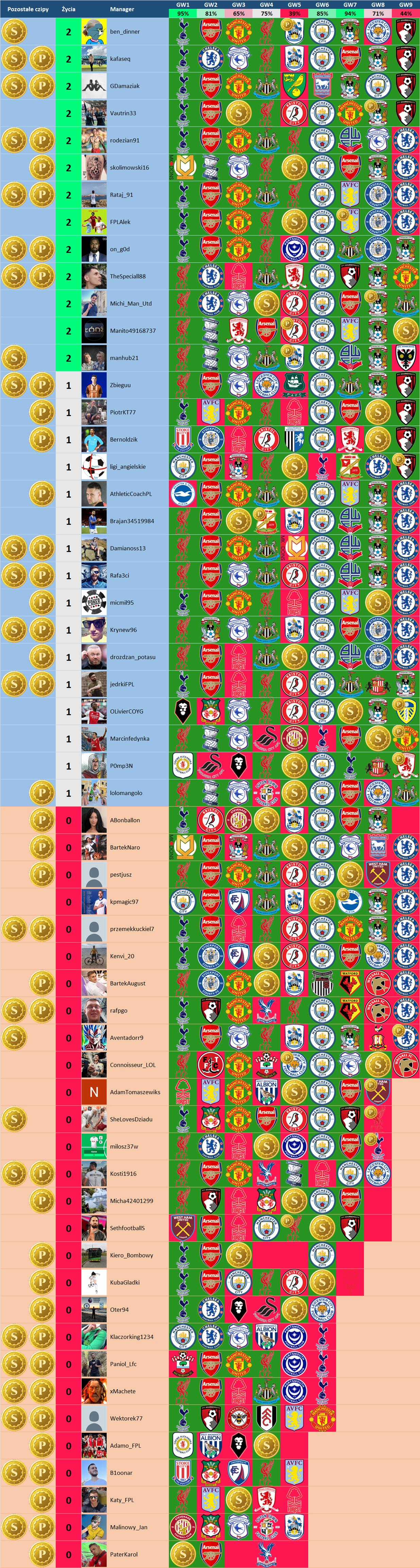W przypadku, gdy się wszyscy pomylą w danej kolejce to kazdy przechodzi dalej, a wytypowana drużyna w tej kolejce już nie może być użyta.