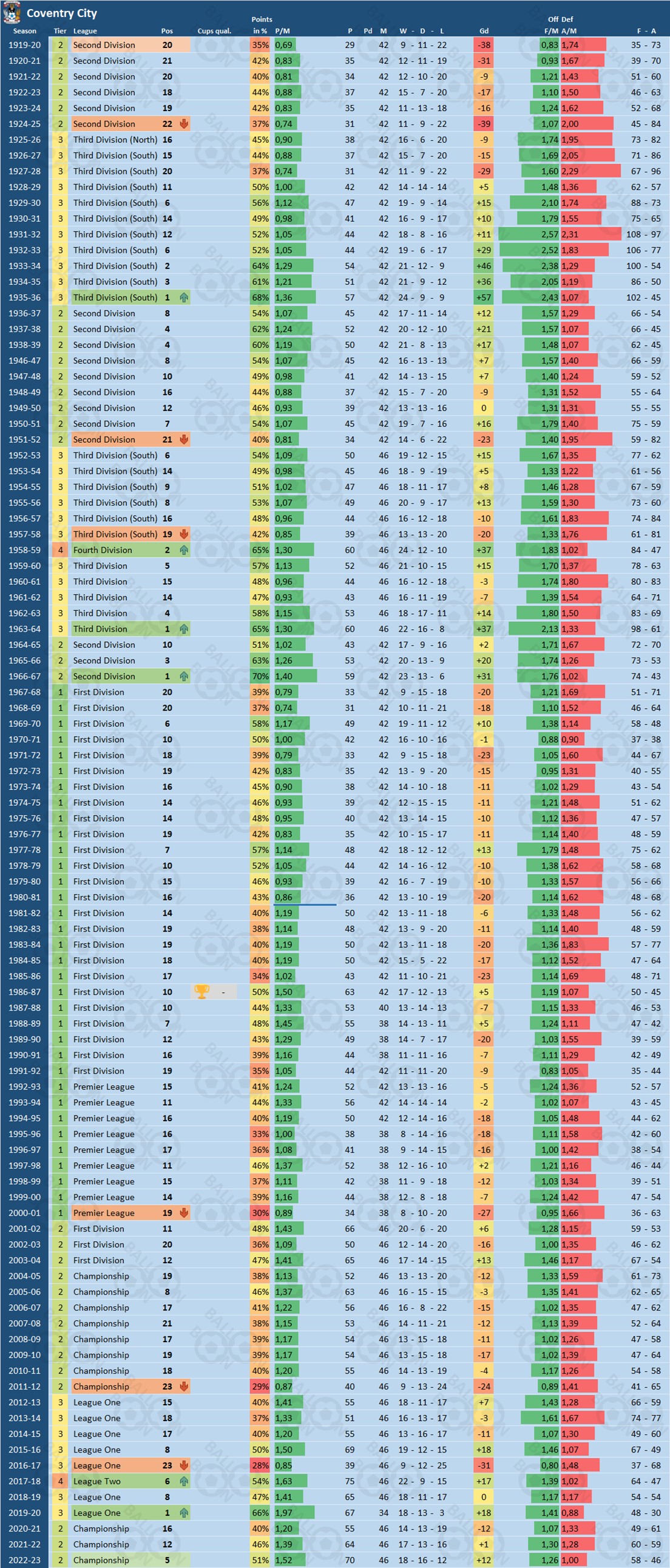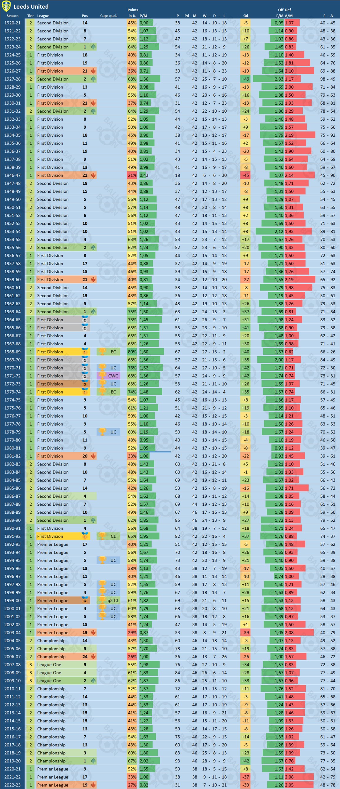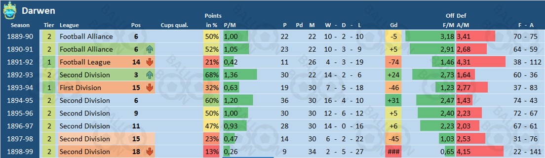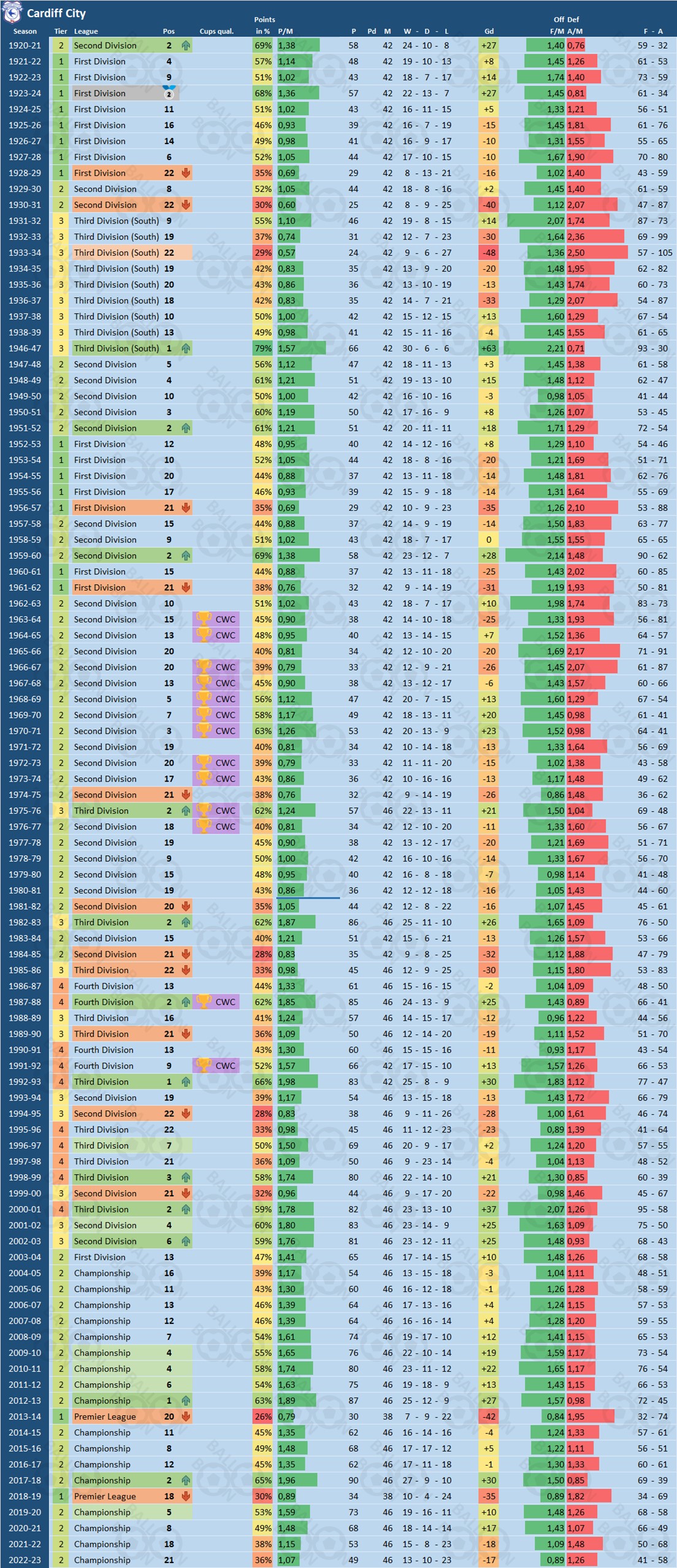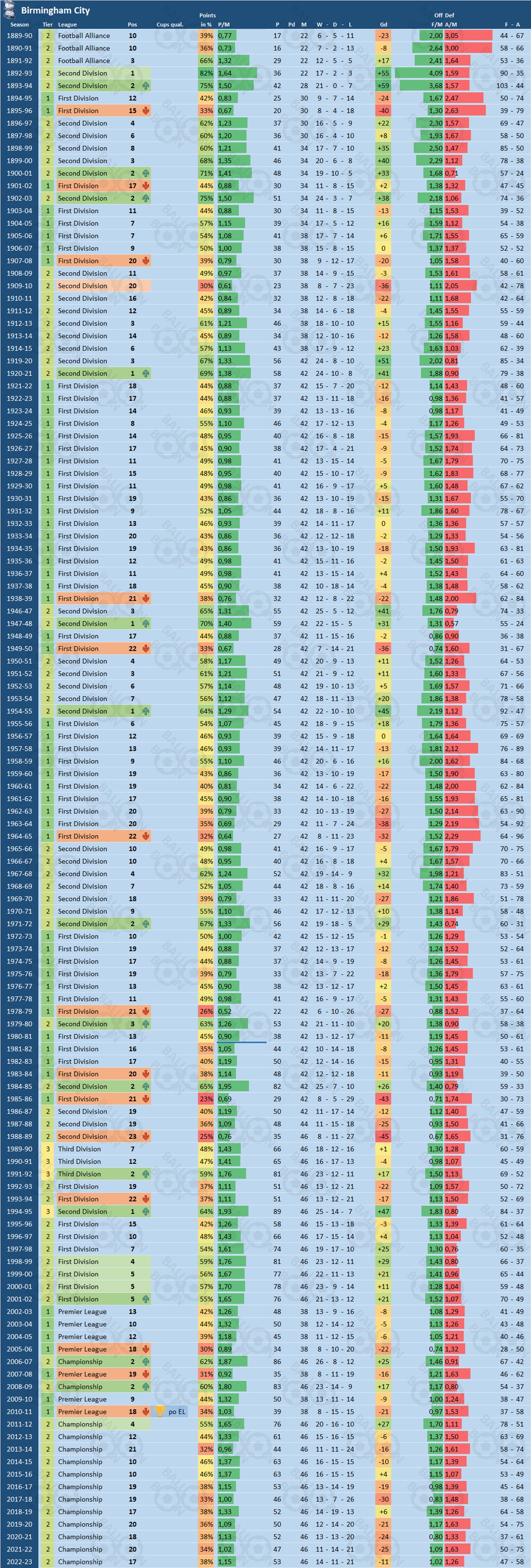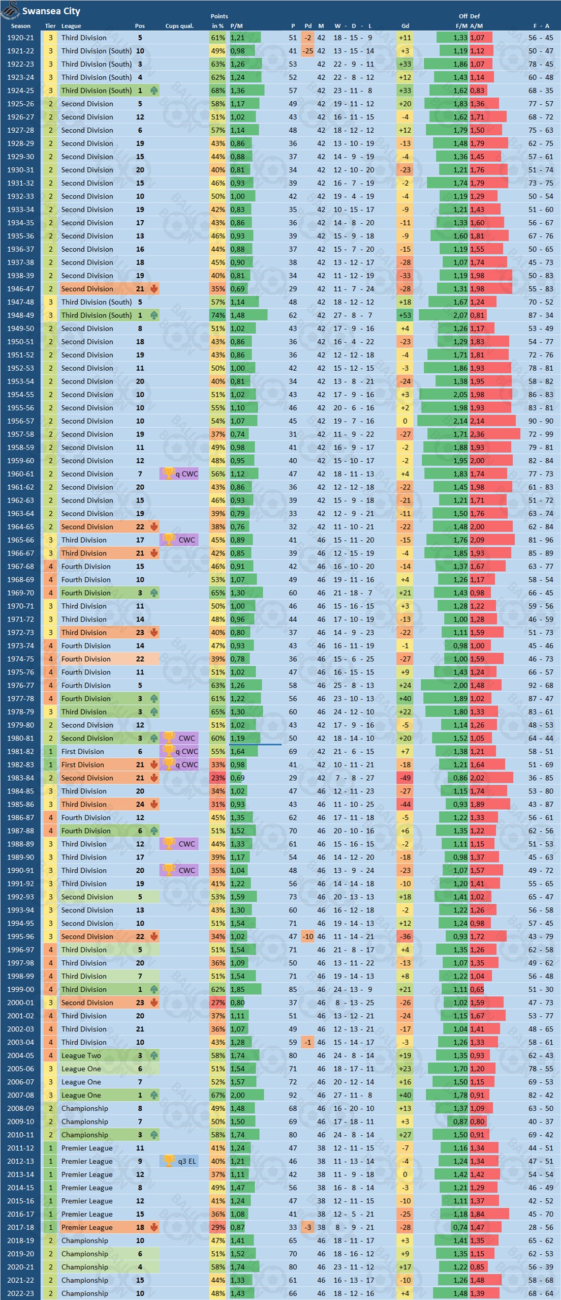 Poniższa lista przedstawia szczegółowo wszystkie sezony danego klubu w ligowym futbolu.